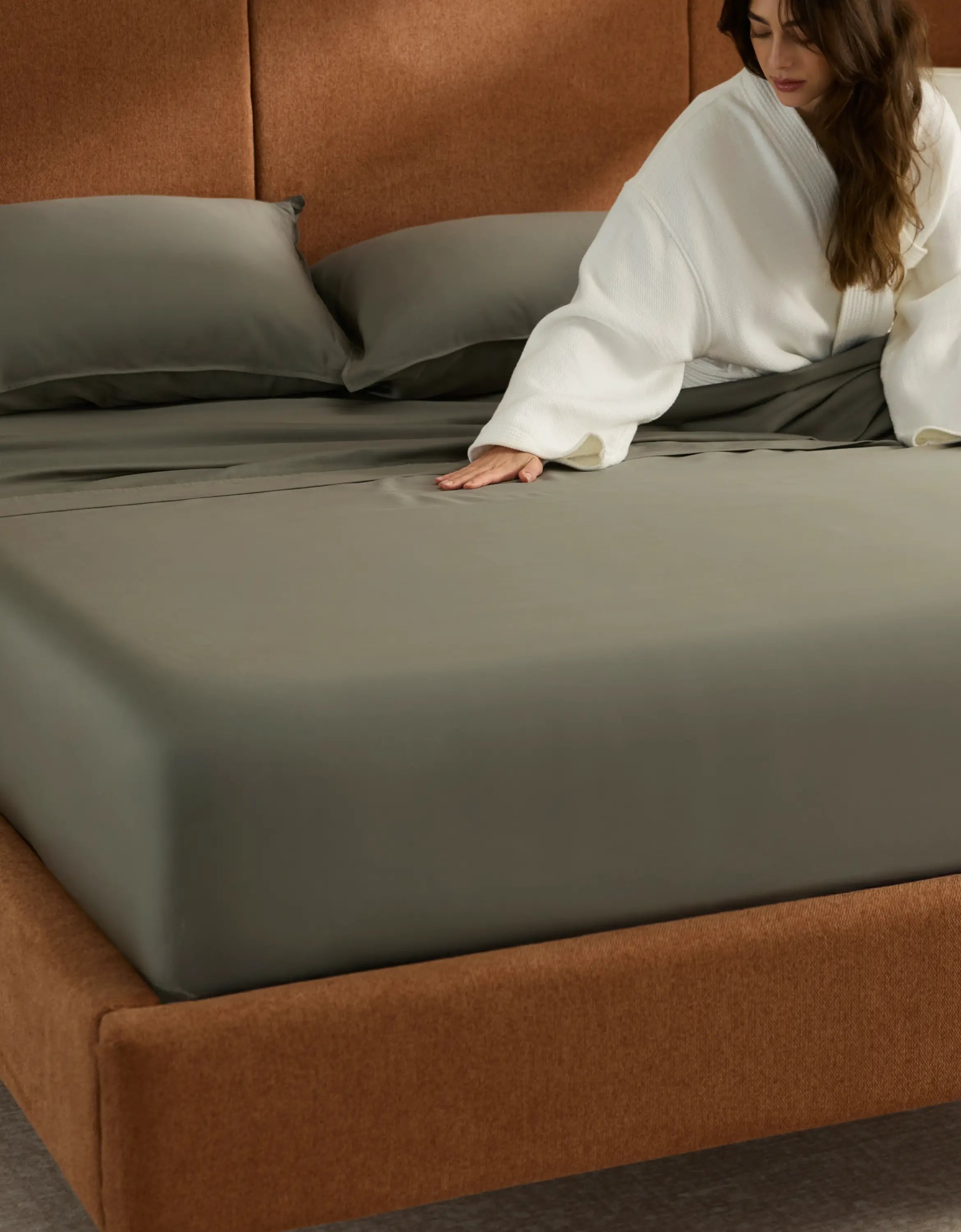 Bedroom with green bedding and white blanket, wooden headboard, and side table.