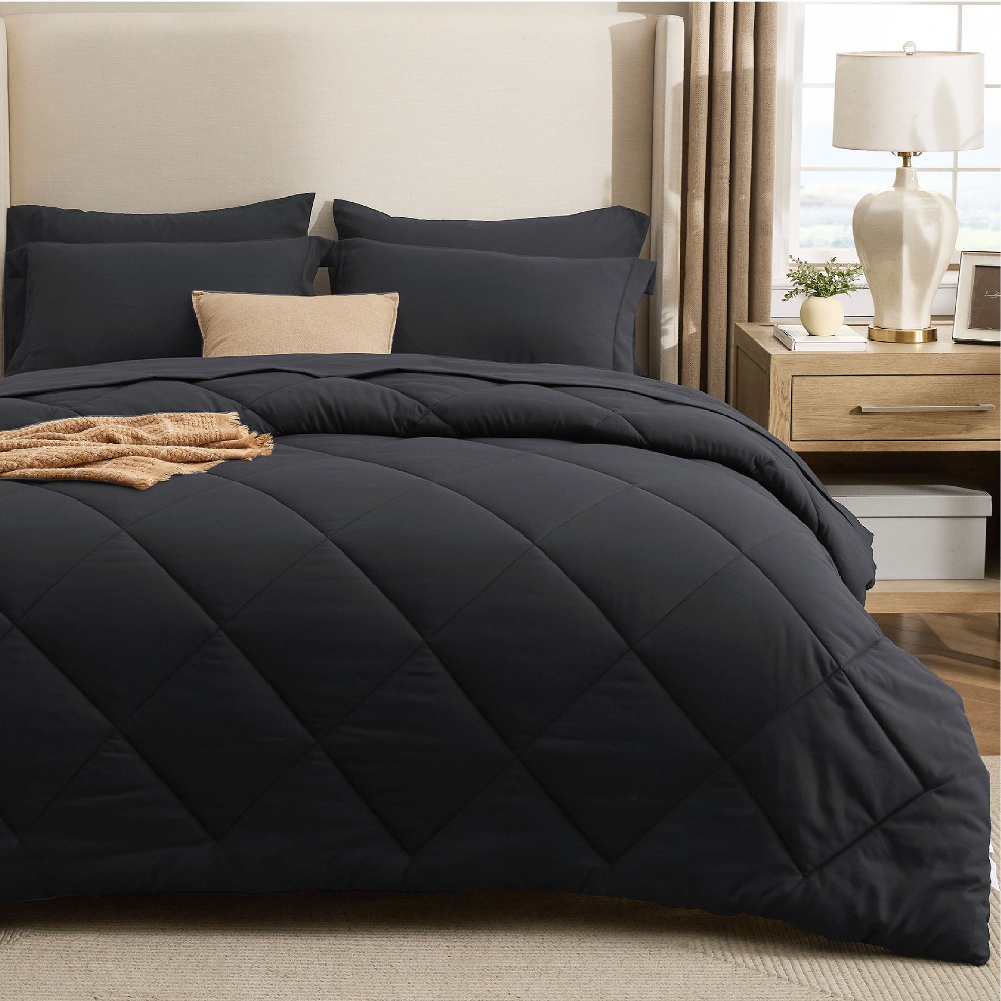 Classic Elegance: Designed with diamond quilting and rounded edges, this queen bed set exudes refined elegance while keeping the filling evenly fluffed. Available in timeless shades like classic black, it’s easy to mix and match with any bedroom décor.
