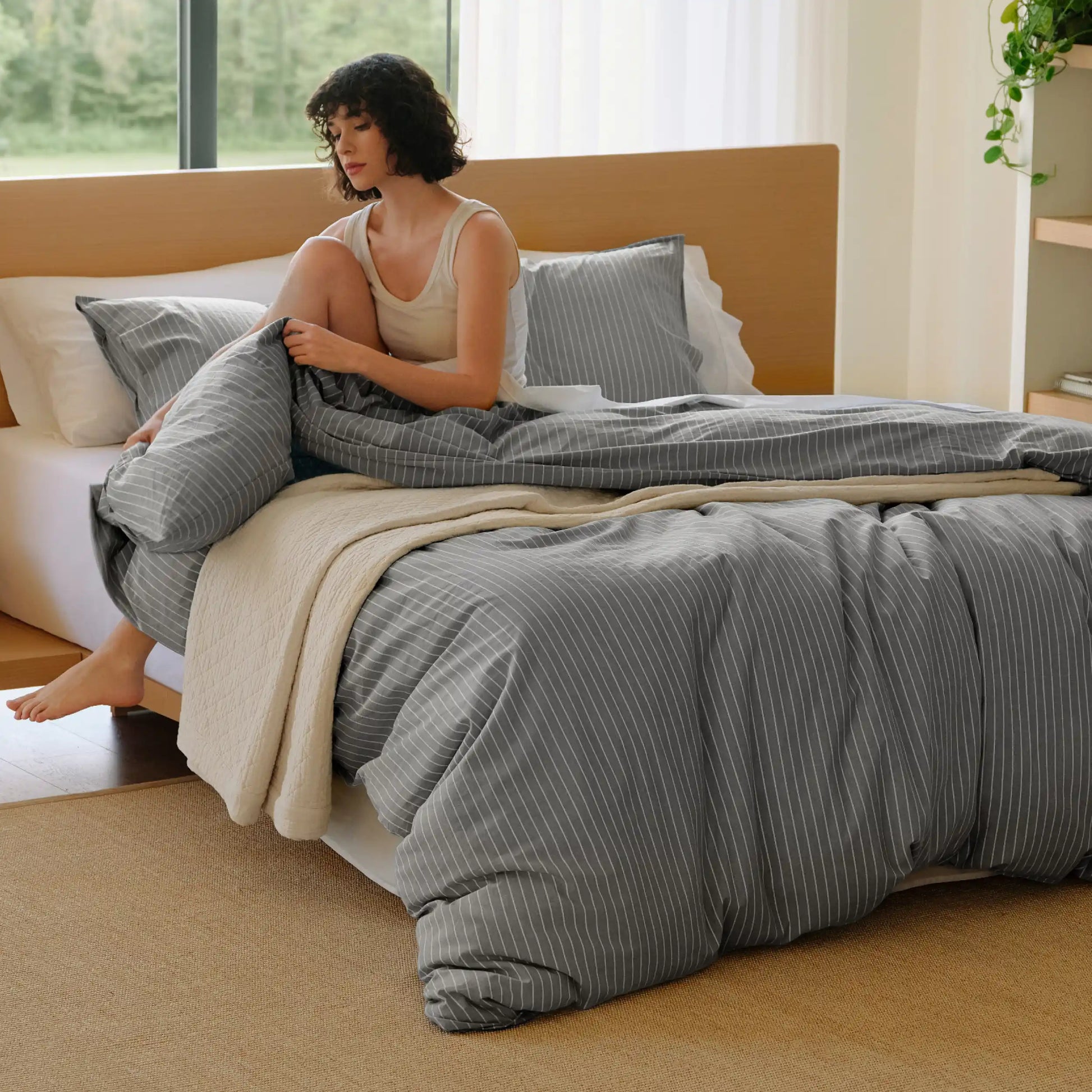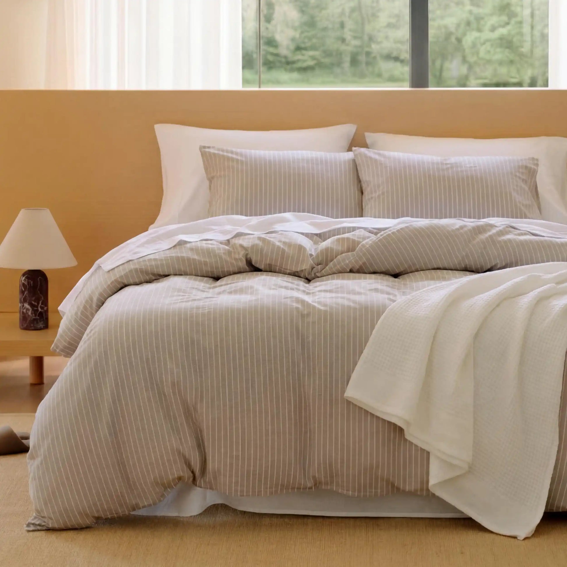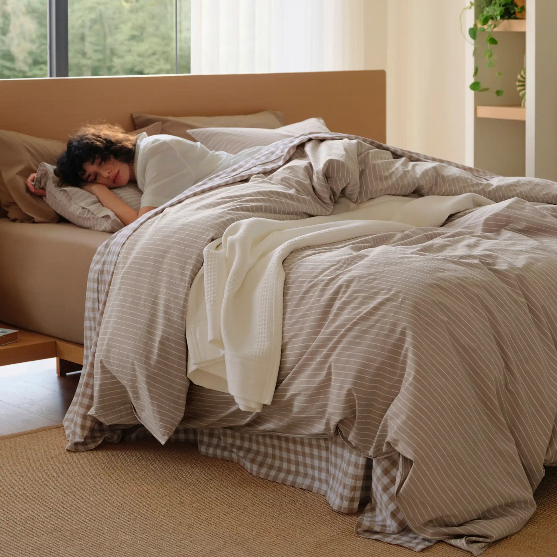 Striped, Gingham & Reversible: Linen-look washed cotton with timeless striped or gingham pattern, reversible design, and relaxed drape, easily matching any bedroom decor style.