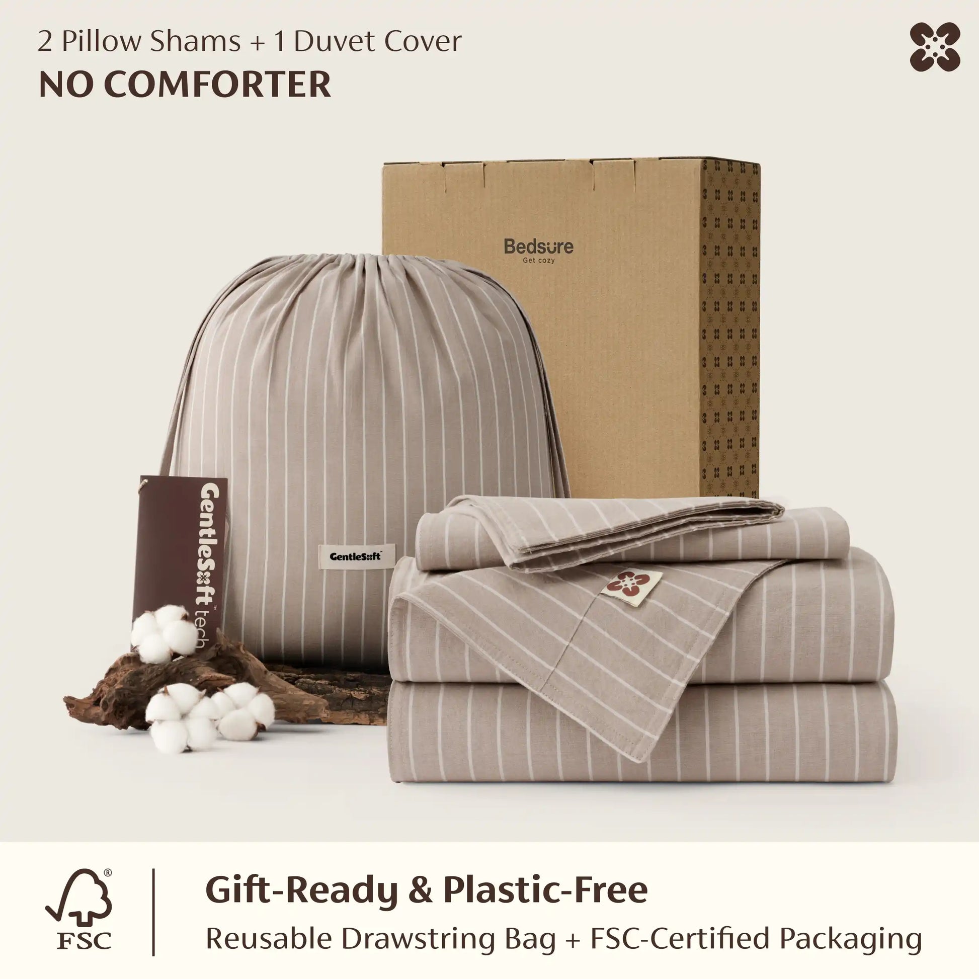 1 Duvet Cover , 2 Pillow Shams, packaged in a reusable drawstring bag.